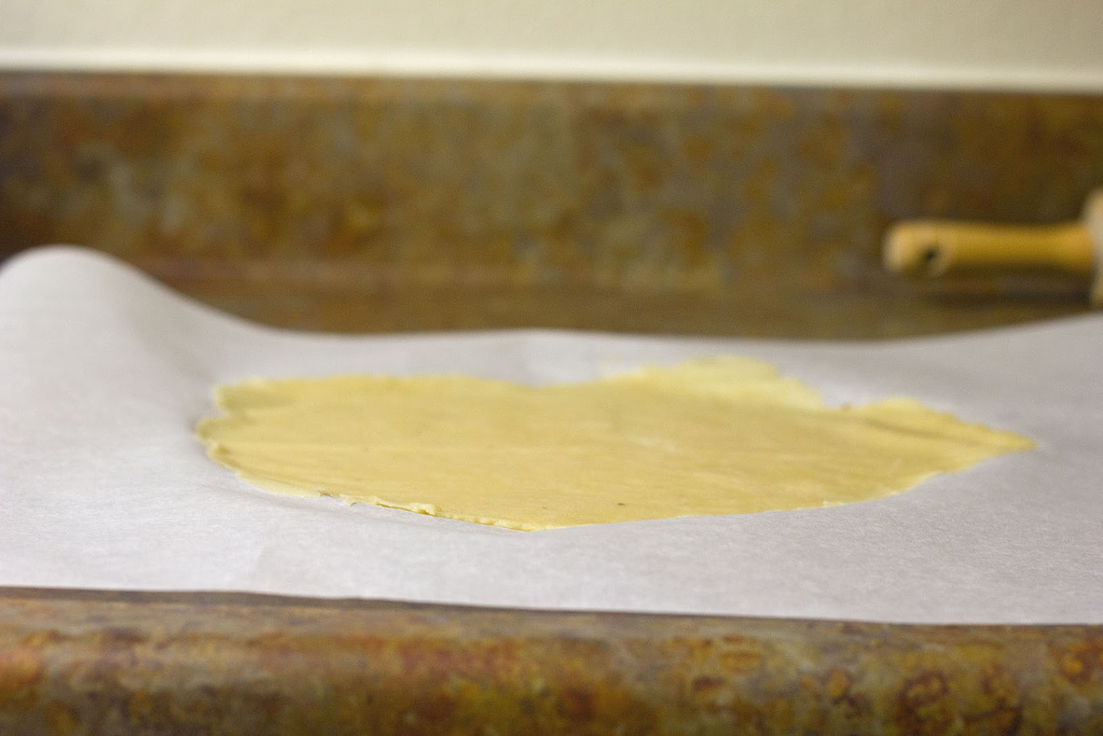 Rip out two sheets of parchment paper. Lay one piece down on the counter, and coat the second piece with oil. Almond flour dough is incredibly sticky, and without the oil you won’t be able to peel off the parchment paper without taking your crackers with it. Place the dough in the middle of the unoiled parchment paper and place the oiled piece on top. Using a rolling pin, spread and level out the dough to about 1/8” thickness. Remove the top piece of parchment paper and using a greased pizza cutter, cut squares into the dough.